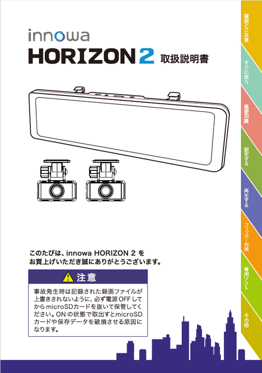 innowa HORIZON 2 の取扱説明書 (マニュアル)をPDFファイルでダウンロードできます。本機のご利用前に、このマニュアルをよくお読みの上、説明の通り正しくお使いください。