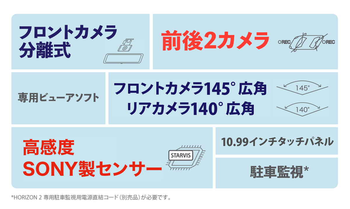 ■広角レンズ搭載で145°(フロント)、140°(リア)のワイドな視界を確保。後方の死角を減らします。