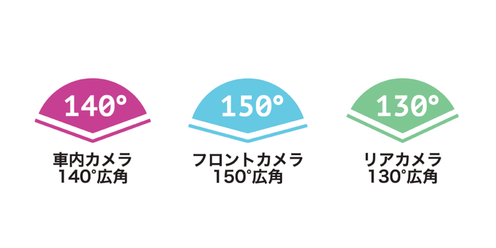 ■広角レンズ搭載で、150°(フロント)、140°(車内)130°(リア)のワイドな視界を楽しめます。