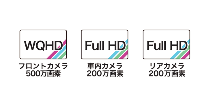 - 撮像素子 フロントカメラは WQHD (2560×1440)、車内・リアカメラはFull HD 1080p (1920×1080p) 画質での録画ができます。まるで肉眼で捉えたままのような、鮮明な映像で記録します。