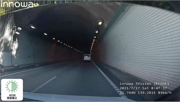 フロントカメラにはWDR(ワイドダイナミックレンジ)機能を搭載。トンネルなど明るさが急変する場所でも白飛び・黒つぶれを起こさず、確実に録画を行います。
