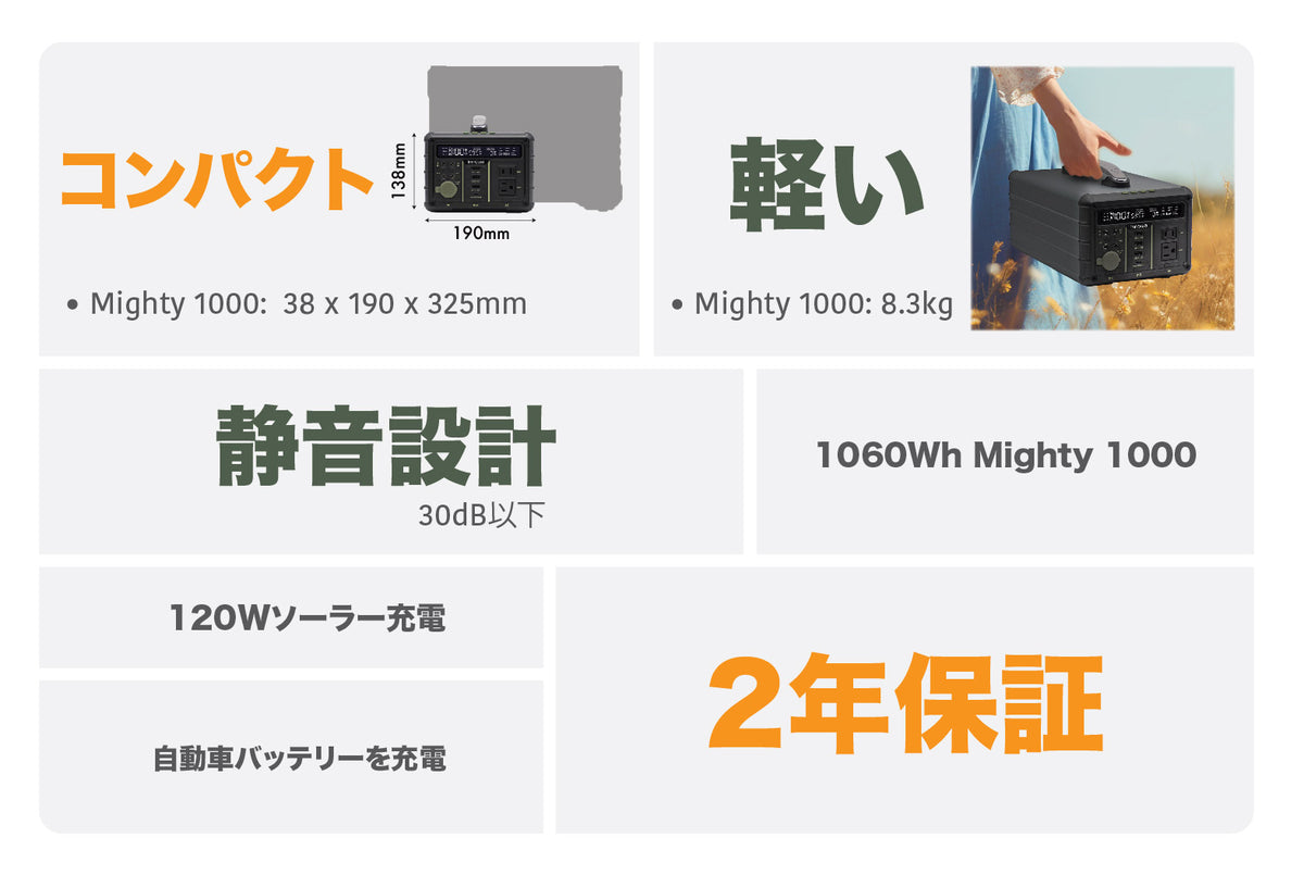 - Mighty 1000は8.3kgと非常に軽量です。そのため、持ち運びが簡単で、どこでも楽に移動できます。