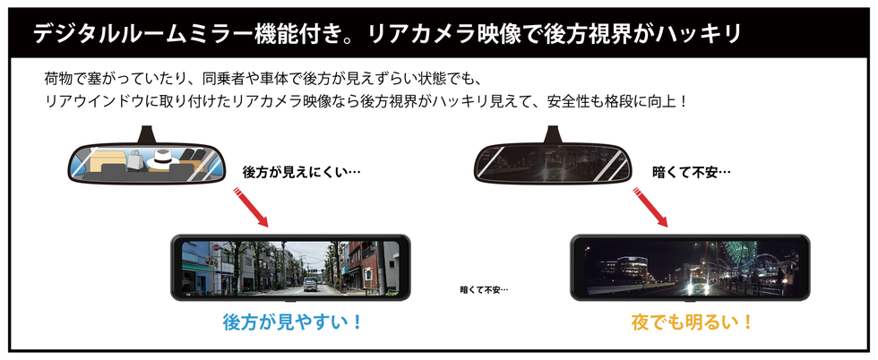 デジタルミラー機能付き。リアカメラ映像で後方視界がハッキリ