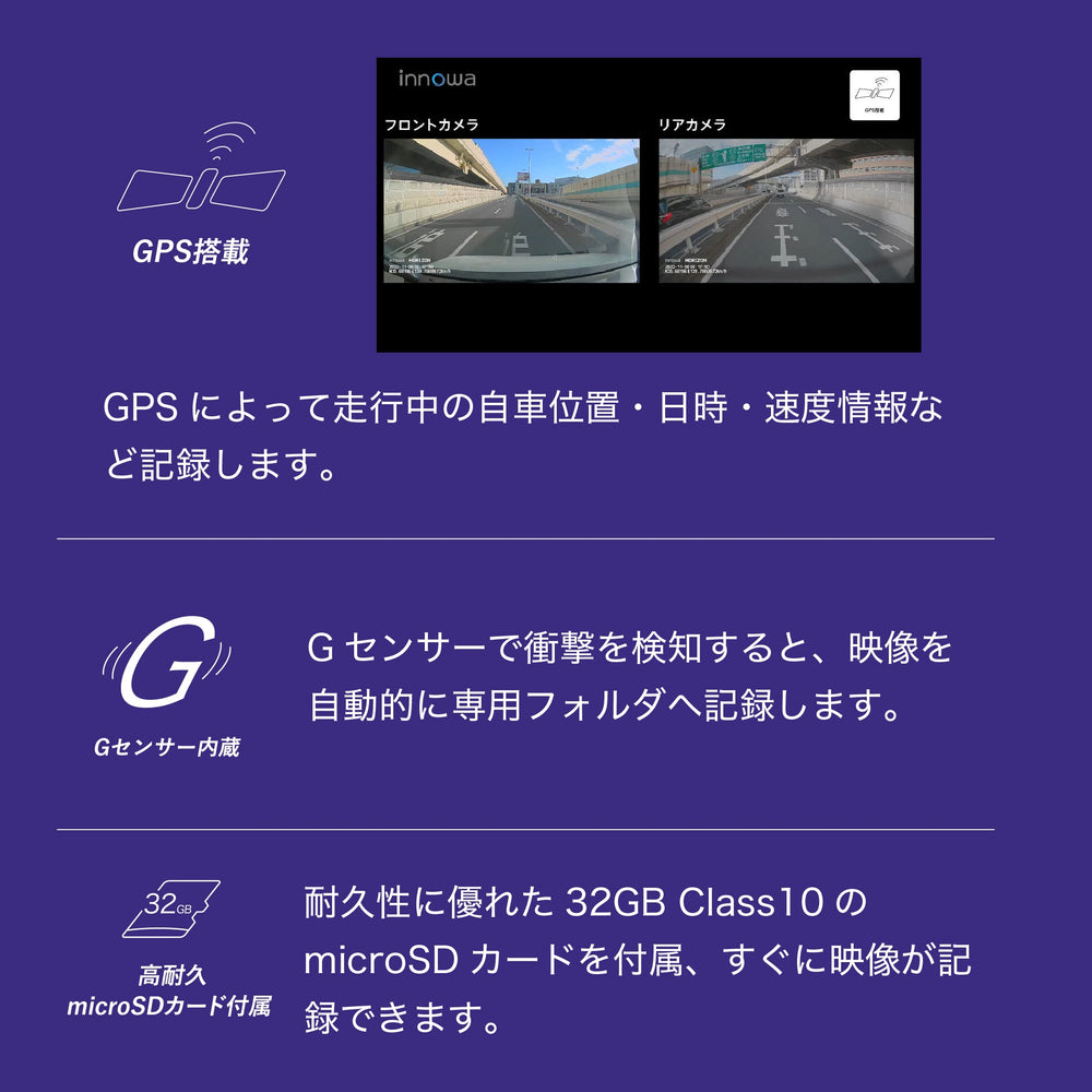 - 耐久性に優れた32GB Class10のmicroSDカードを付属、すぐに映像が記録できます。 独自のファイルシステムを採用、録画ファイルの断片化を減らし、エラー発生率を低減したメンテナンスフリー設計です。