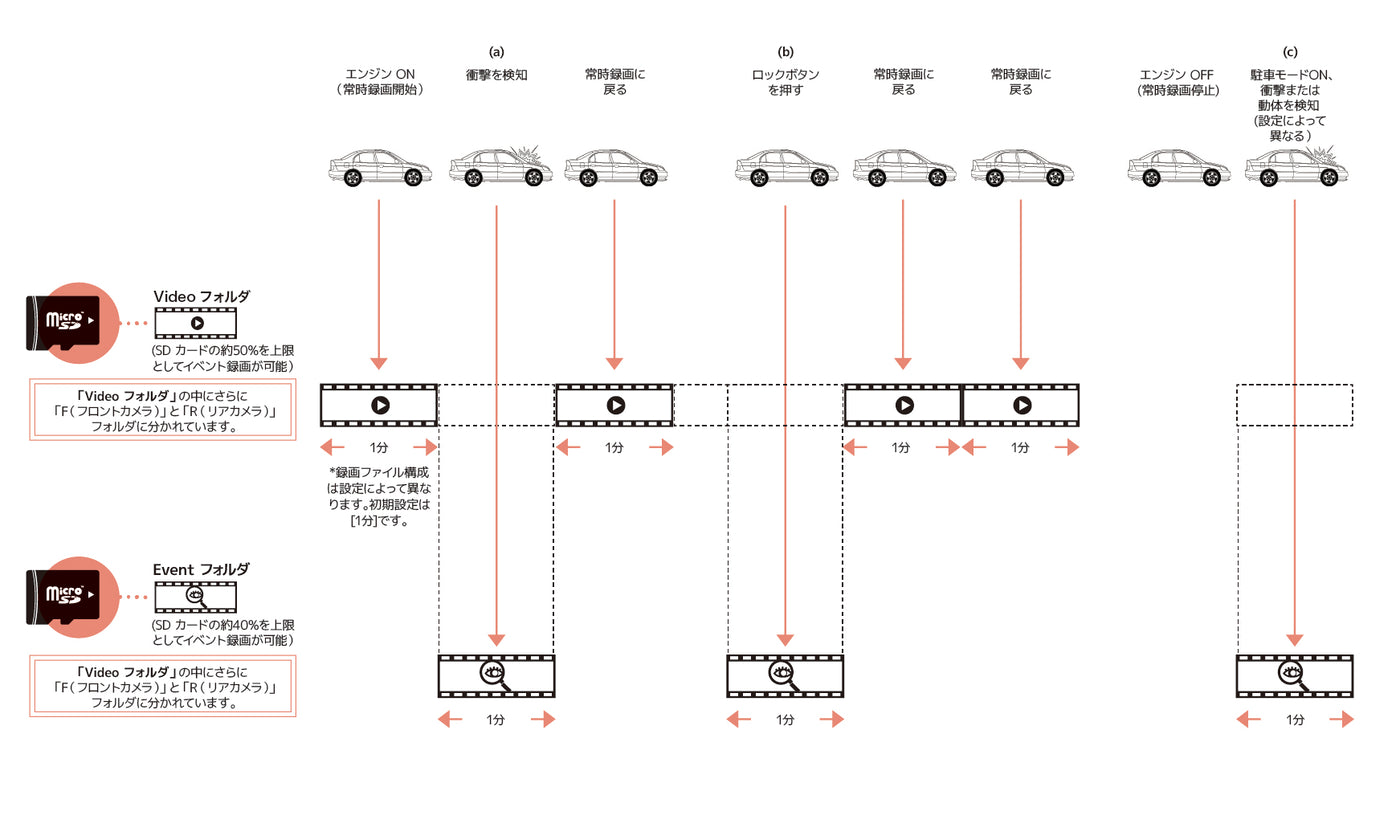 内蔵のGセンサーは車の異常振動を検知すると、即時に録画を開始します。