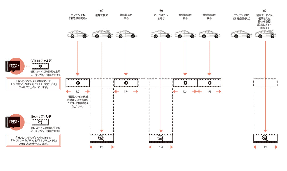 1.エンジンをかけると、自動で録画が始まります。保存するファイルは「Video」フォルダに保存されます。