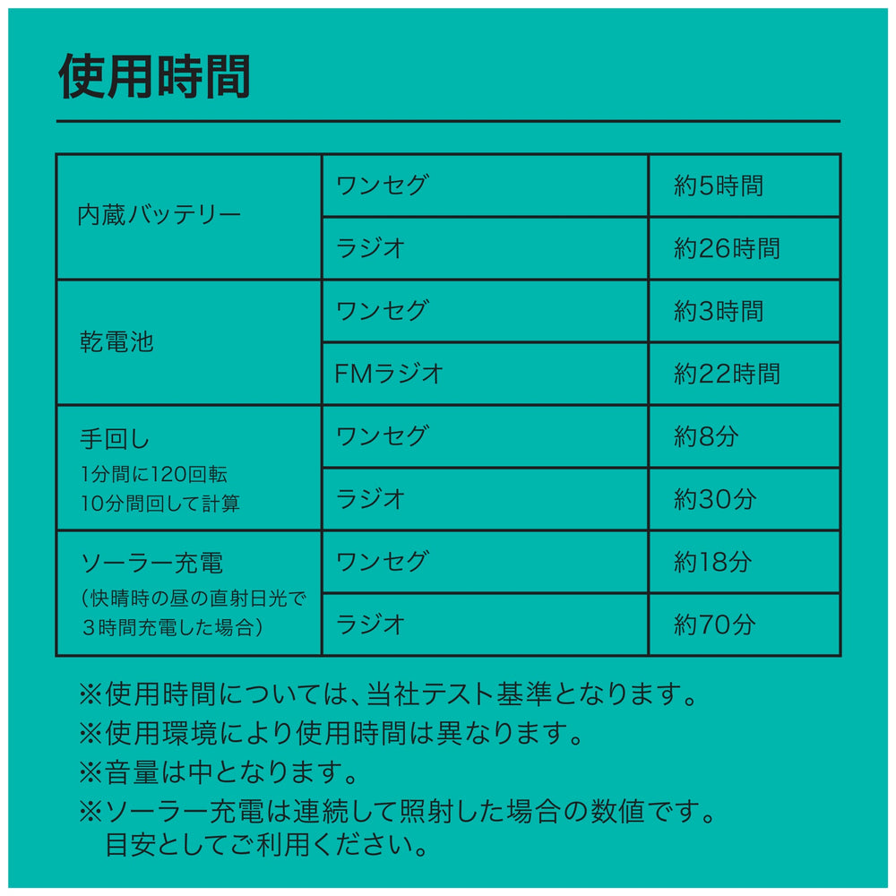 ■乾電池:ワンセグ 約3時間/FMラジオ 約22時間