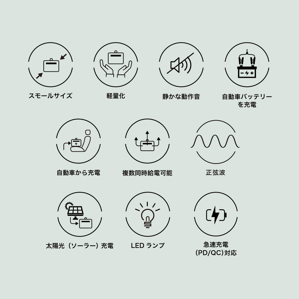 - AC 出力は、家庭用コンセントと同じ 「正弦波」。さまざまな家電製品を安心して使用できます。背面には10WのLEDランプが搭載されており、2段階の明るさと、SOSモードを含む2つのフラッシュモードが用意されています。