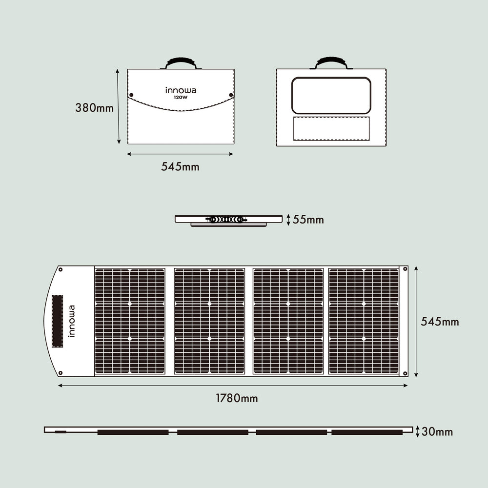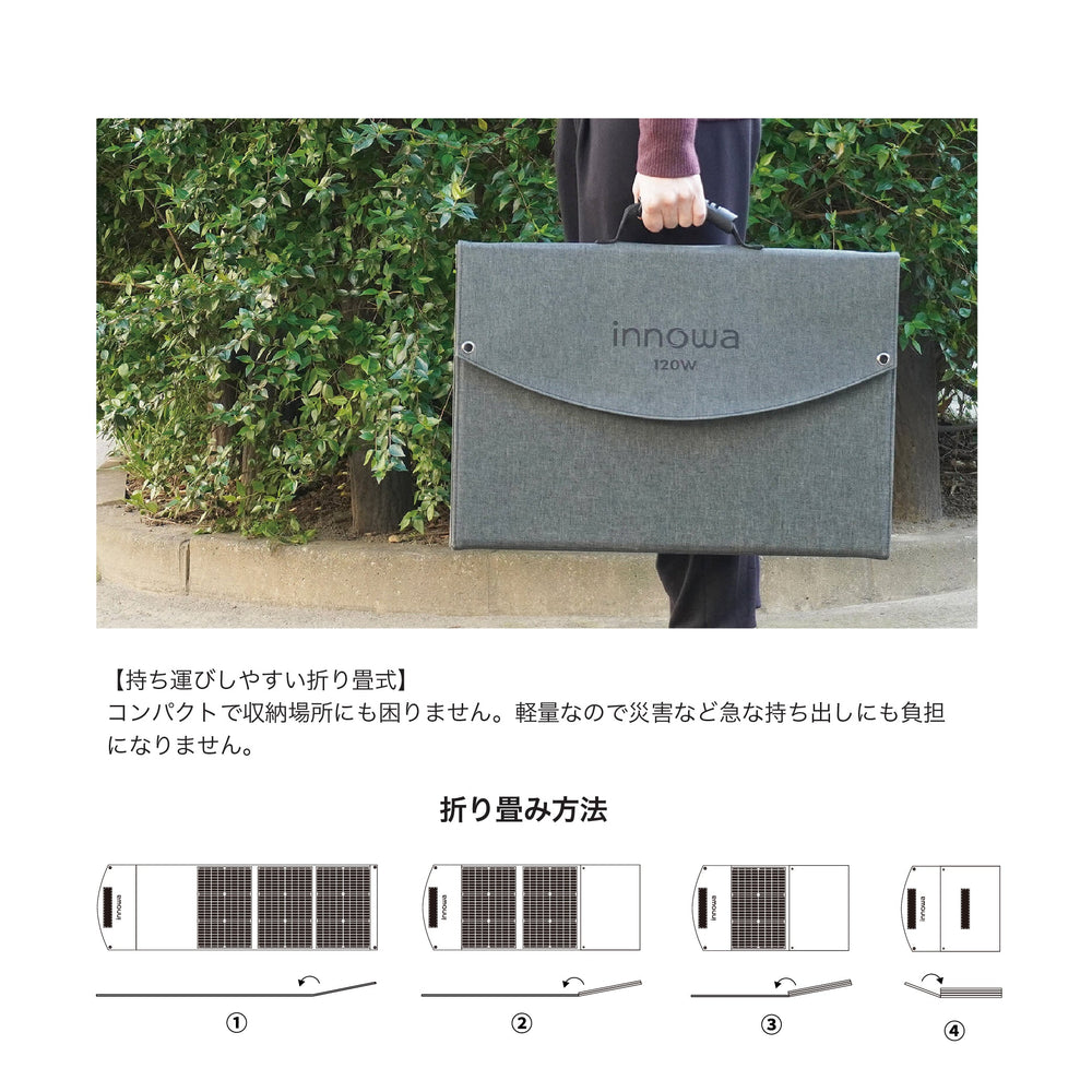 innowaポータブル電源に対応したソーラーパネル120は、クリーンで使いやすいエネルギーを手軽に利用できる優れた製品です。太陽光を利用して充電するため、コンセントのない場所でもUSB端子で最大出力120Wの充電・給電が可能です。急速充電機能を備えているため、スマートフォン、タブレット、ノートパソコンなどが素早く充電できます。折りたたみ式で持ち運びも簡単で、キャンプや災害時には非常に役立ちます。